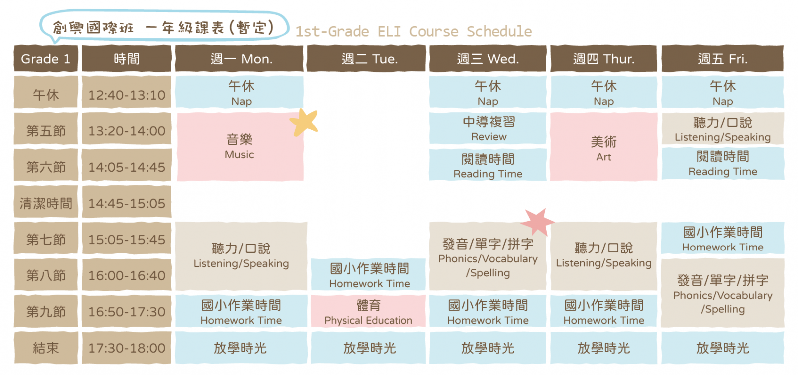 課程仿效美國國小的教學安排,涵蓋聽說讀寫及藝能科目等多元領域。孩子們將沉浸在全英語環境中,讓英語不僅是第二語言,更成為他們日常生活與學習的工具。