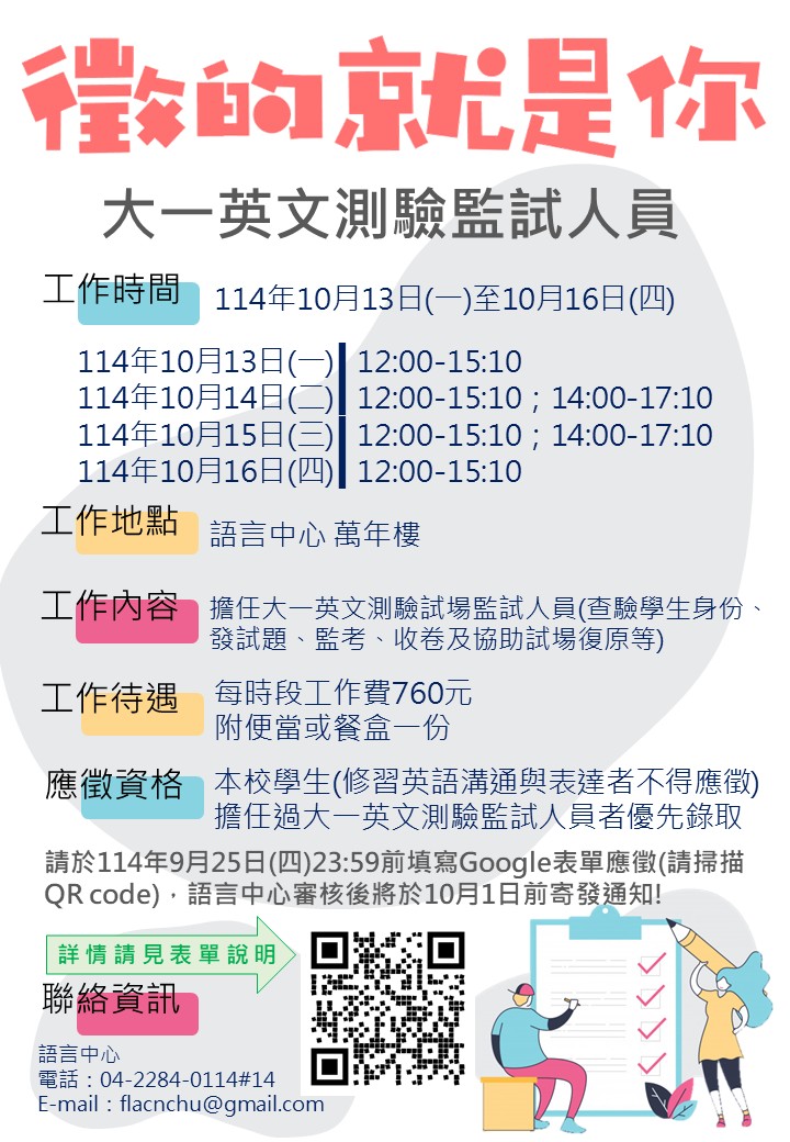 【招募監試人員】114-1大一英文測驗 2025/09/19 監試工作內容說明及規定,請參閱報名表單。 敬請於9月25日(四)23:59前填寫報名表單應徵, 報名連結:https://forms.gle/3ePB7m2PqFs4jSkp8 如有任何疑問,請來信或來電洽詢 Email:flacnchu@gmail.com Tel:04-22840114#14